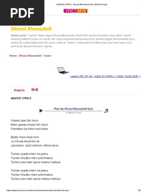 Vaaste Dhvani Bhanushali Nikhil D Souza Romantic Song Lyrics Song Lyric Quotes Movie Love Quotes - Our website provide lyrics of songs.new song and we submitt songs on this site.
